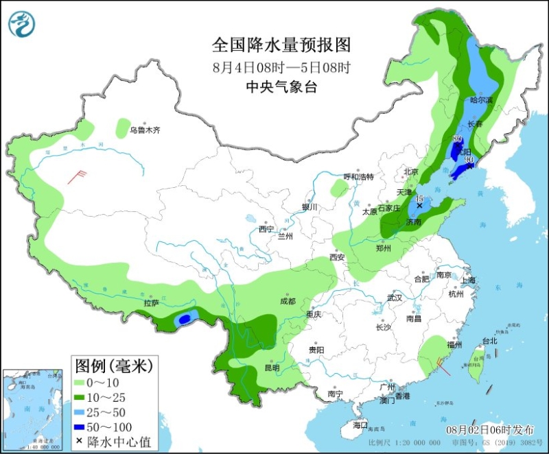 8月4日08時(shí)至5日08時(shí),內(nèi)蒙古東北部、東北地區(qū)中西部和南部、西藏東部、黃淮北部、云南中西部等地部分地區(qū)有中到大雨,其中,遼寧中北部和南部、西藏東南部等地部分地區(qū)有暴雨(50~90毫米)。新疆南疆盆地部分地區(qū)有5~6級(jí)風(fēng)。