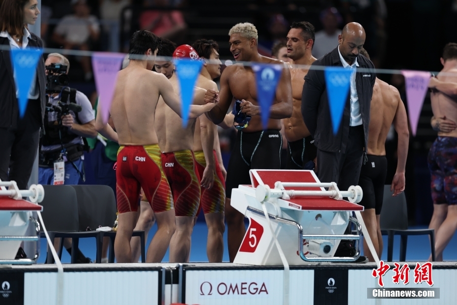 當(dāng)?shù)貢r間8月4日,在巴黎奧運會游泳項目男子4x100米混合泳接力決賽中,由徐嘉余、覃海洋、孫佳俊、潘展樂組成的中國隊奪得金牌。圖為場上運動員相互致意。