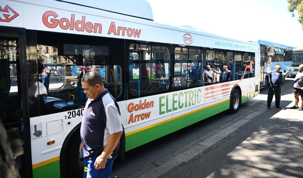 2024年2月28日,在南非立法首都開普敦,人們在公交總站登上一輛比亞迪電動公交車。(圖源:新華社)