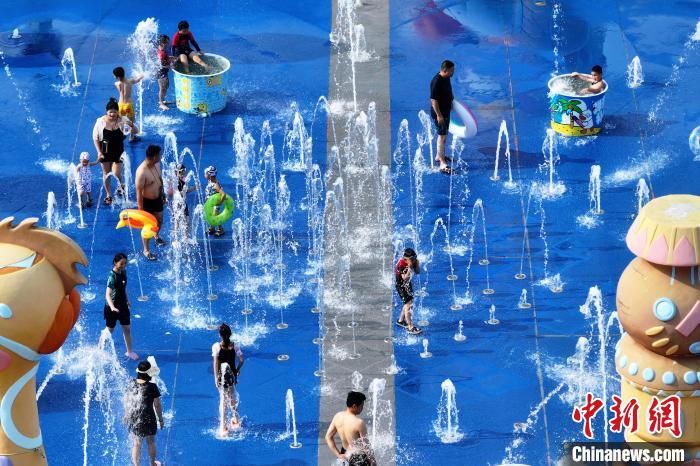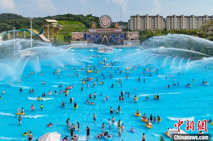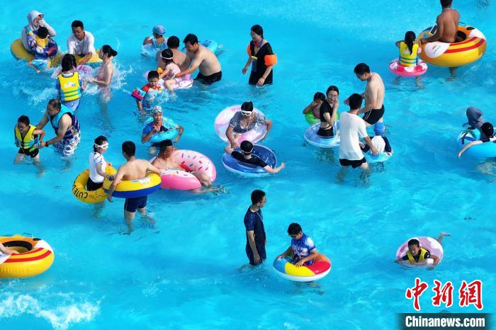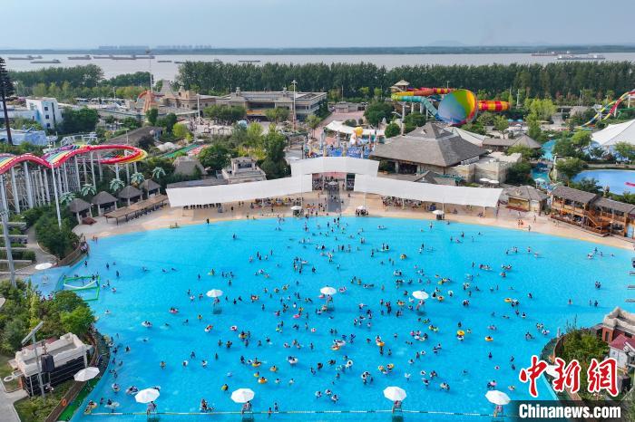 8月11日,江蘇南京,民眾在一處水上樂(lè)園內(nèi)戲水覓清涼。近期,當(dāng)?shù)馗邷靥鞖獬掷m(xù)。(無(wú)人機(jī)照片)中新社記者 泱波 攝