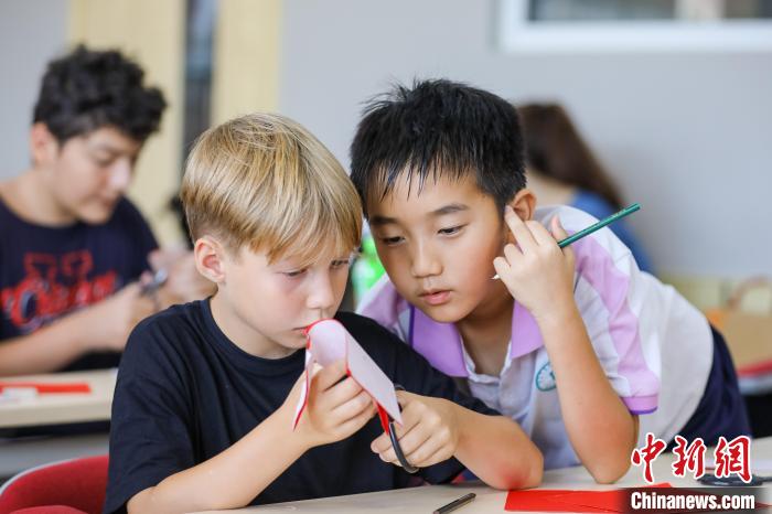 8月12日,俄羅斯學(xué)生交流創(chuàng)作剪紙作品。當(dāng)日,12名俄羅斯學(xué)生走進(jìn)位于山東省青島市李滄區(qū)的恒星科技學(xué)院,通過(guò)體驗(yàn)剪紙、手繪京劇臉譜和團(tuán)扇,近距離感受中華傳統(tǒng)文化的魅力。張鷹 攝