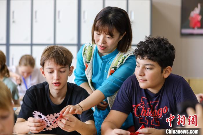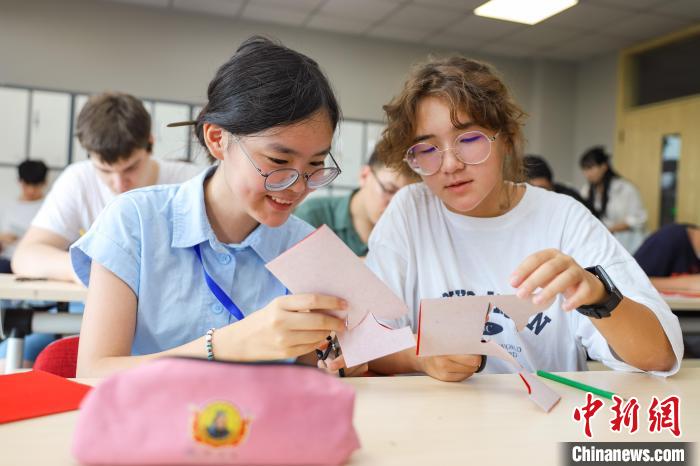 8月12日,中俄學(xué)生交流剪紙技巧。當(dāng)日,12名俄羅斯學(xué)生走進(jìn)位于山東省青島市李滄區(qū)的恒星科技學(xué)院,通過(guò)體驗(yàn)剪紙、手繪京劇臉譜和團(tuán)扇,近距離感受中華傳統(tǒng)文化的魅力。張鷹 攝