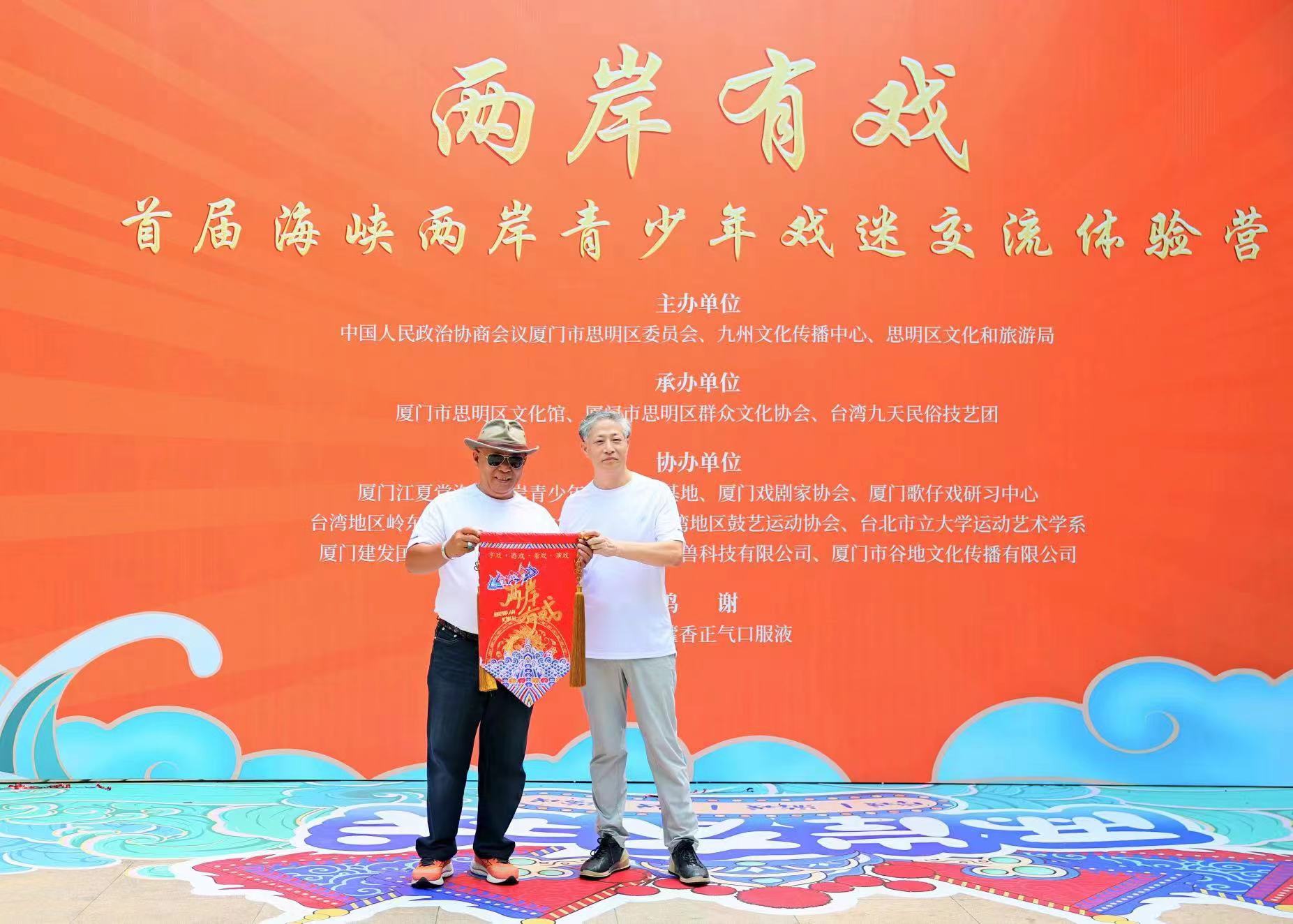 開(kāi)營(yíng)儀式上,徐徐打開(kāi)的中國(guó)紅戲曲折扇把“兩岸有戲”的金色圖標(biāo)映襯得光彩奪目,無(wú)人機(jī)將“薪火相傳”、“扇結(jié)良緣”的對(duì)軸在空中瞬間展開(kāi)與其呼應(yīng),橙色的彩帶像陽(yáng)光一樣盡情綻放,傳統(tǒng)文化與現(xiàn)代科技融合的開(kāi)場(chǎng)獨(dú)具匠心,吸引了許多民眾駐足欣賞。 多位“梅花獎(jiǎng)”、“群星獎(jiǎng)”、 “金馬獎(jiǎng)”、 “牡丹獎(jiǎng)”的名師得主們,將傳統(tǒng)折扇和龍融吉祥物贈(zèng)予臺(tái)灣青少年代表,用 “兩岸傳遞、扇結(jié)良緣”來(lái)詮釋文化同脈的深厚底蘊(yùn)。當(dāng)思明區(qū)政協(xié)蘇德本主席用非遺盤金繡工藝制作的“兩岸有戲”營(yíng)標(biāo)旗交接到臺(tái)灣九天民俗技藝團(tuán)許振榮團(tuán)長(zhǎng)手中,“兩岸有戲”雙向交流活動(dòng)開(kāi)幕。