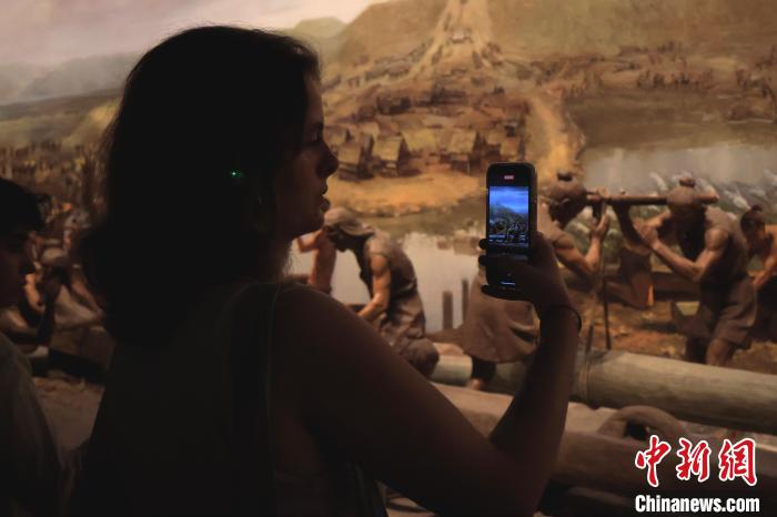 8月14日,亞歐青年領(lǐng)導(dǎo)人交流營(yíng)活動(dòng)在浙江杭州舉行,來自47個(gè)國(guó)家的50余名青年代表走進(jìn)良渚博物院,感受五千年中華文明魅力。圖為一名青年在拍攝良渚先民勞作的塑像。中新社記者 鮑夢(mèng)妮 攝