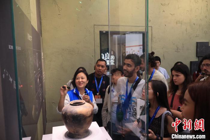8月14日,亞歐青年領(lǐng)導(dǎo)人交流營(yíng)活動(dòng)在浙江杭州舉行,來自47個(gè)國(guó)家的50余名青年代表走進(jìn)良渚博物院,感受五千年中華文明魅力。圖為亞歐青年參觀刻符陶罐。中新社記者 鮑夢(mèng)妮 攝