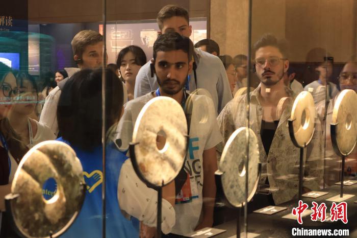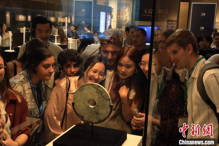 8月14日,亞歐青年領(lǐng)導(dǎo)人交流營(yíng)活動(dòng)在浙江杭州舉行,來自47個(gè)國(guó)家的50余名青年代表走進(jìn)良渚博物院,感受五千年中華文明魅力。圖為亞歐青年參觀刻鳥立高臺(tái)符玉璧。中新社記者 鮑夢(mèng)妮 攝