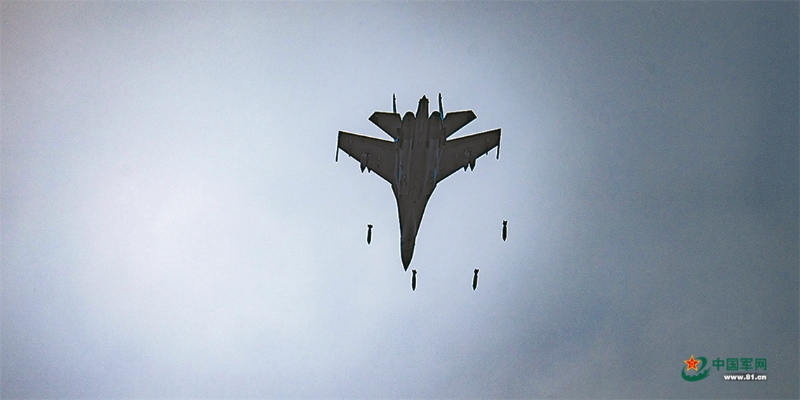 首輪打擊后,戰(zhàn)機拉起躍升,大機動脫離,數(shù)分鐘后再次進入攻擊航線,對靶標實施輪番轟炸。靶場上空,爆炸聲久久回蕩……