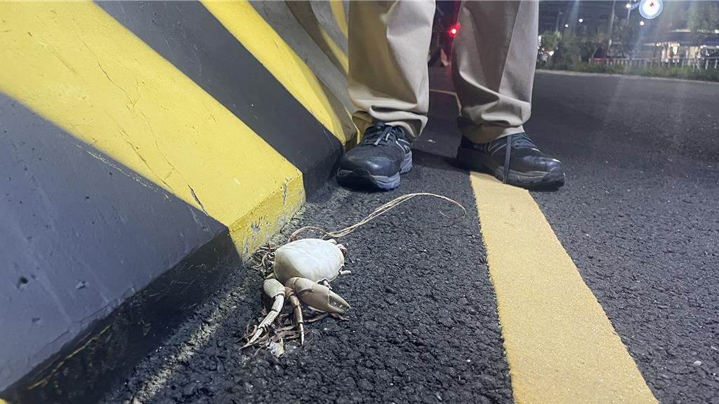 臺南社大助理研究員陳泰豪表示,2022年展開護蟹行動,當(dāng)時和緯路5段工程正要施工辟建,當(dāng)年記錄到5、60只的陸蟹,不包含遭路殺的陸蟹;去年和緯路5段通車,還是有觀察記錄到2位數(shù)陸蟹,今年進入第3年的護蟹行動,卻只記錄到3只陸蟹,還有5只遭到路殺。