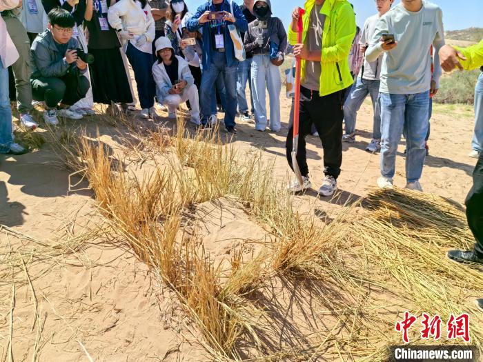 日前,“鑄牢共同體 中華一家親”主題宣傳“塞上江南寫新篇”集中采訪團走進寧夏靈武白芨灘國家級自然保護區(qū)。圖為記者們體驗扎草方格。中新網記者 劉玥晴 攝