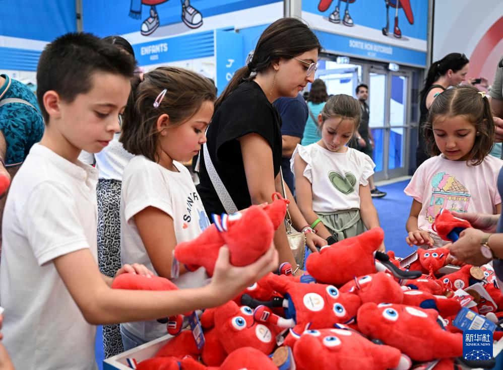 2024年巴黎奧運會80%的奧運會吉祥物“弗里吉”是中國制造。圖為6月27日,小顧客們在選購“弗里熱”周邊紀念品。(圖源:新華社)