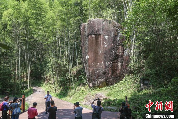 圖為9月2日,采訪團一行來到贛州崇義縣齊云山深處的《平茶寮碑》石刻參觀,該石刻為當年王陽明率軍剿滅“山賊”后的石刻碑文真跡。中新社記者 劉力鑫 攝