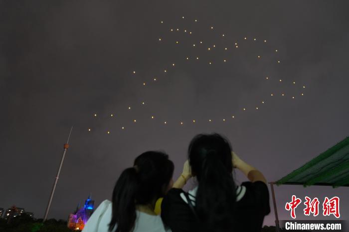圖為工人家屬觀賞無人機(jī)組成的玉兔圖案。中新社記者 楊華峰 攝