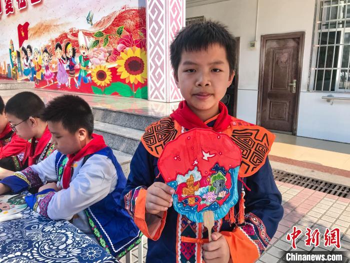 中新網(wǎng)桂林9月13日電(蔣豐慧 歐惠蘭 林浩)“今天我們體驗繪制團扇,我畫了中國的建筑?!?月13日,在廣西桂林市象山區(qū)翠竹小學(xué),六年級的瑤族學(xué)生褚浩宇為自己繪制的長城填色,并向記者展示團扇作品。