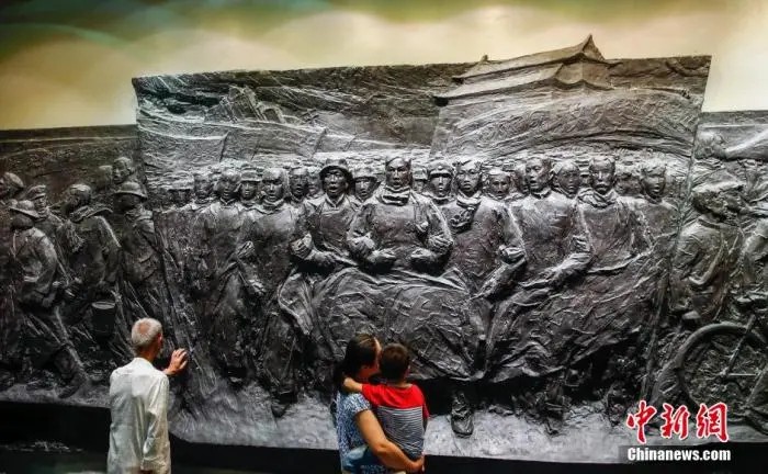 資料圖:民眾參觀北京宛平城內(nèi)中國人民抗日戰(zhàn)爭紀(jì)念館的浮雕。中新社發(fā) 張浩 攝