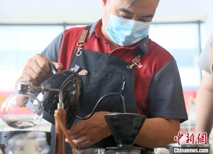 圖為咖啡師在活動現(xiàn)場沖泡興隆咖啡。上世紀50年代起,歸僑們將咖啡種植技術、制作沖泡技術以及喝咖啡的傳統(tǒng)帶到興隆,形成了遠近聞名的興隆咖啡。中新社記者 王曉斌 攝