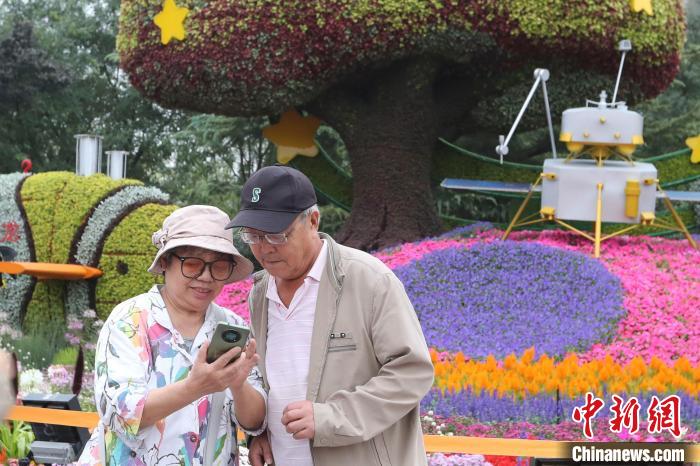 9月28日,北京,游客在“創(chuàng)新中國”花壇前瀏覽照片。中新社記者 王紫儒 攝