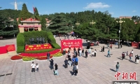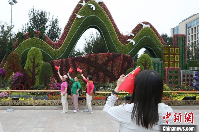 9月28日,北京,游客在“健康中國”花壇前拍照。中新社記者 王紫儒 攝