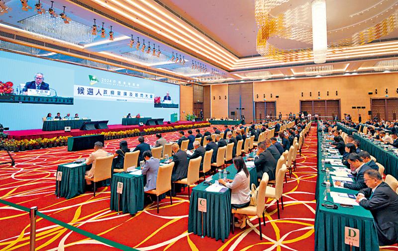 圖:2024澳門行政長官選舉候選人政綱宣講及答問大會昨日舉行。由唯一候選人岑浩輝向400名選委公布政綱及回答選委提問。