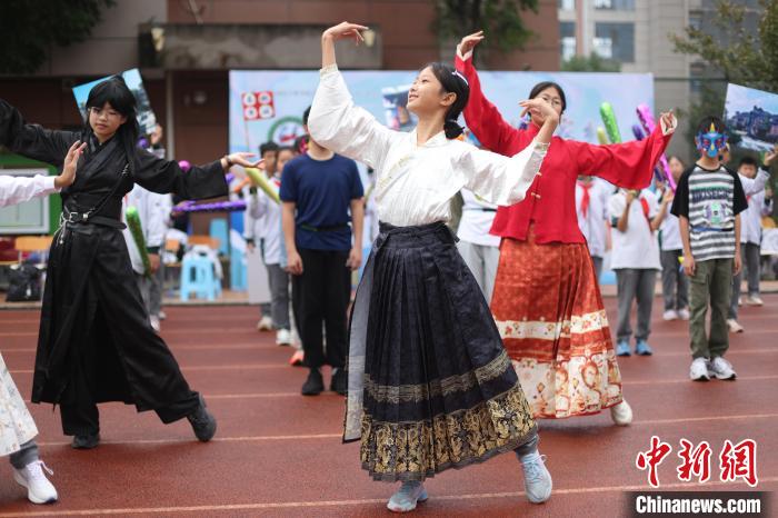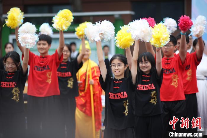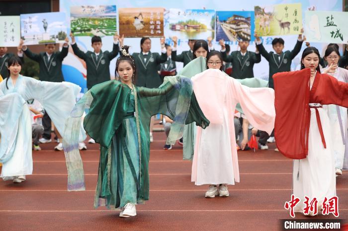 10月17日,江蘇南京,中學(xué)生們?cè)谇锛咎飶竭\(yùn)動(dòng)會(huì)開幕式上表演,用節(jié)目展示江蘇各地特色。當(dāng)日,南京師范大學(xué)附屬中學(xué)新城初級(jí)中學(xué)黃山路分校舉行第十一屆秋季田徑運(yùn)動(dòng)會(huì),本次運(yùn)動(dòng)會(huì)以“共繪家鄉(xiāng)美”為主題,無錫太湖明珠碧波萬頃、徐州的大漢風(fēng)云、連云港的濱海夢(mèng)幻、鹽城的麋鹿與丹鶴共舞、南京的美食與人文薈萃……學(xué)生們以新穎別致的創(chuàng)意在開幕式上“點(diǎn)亮”江蘇十三個(gè)地市的“招牌”,令整個(gè)運(yùn)動(dòng)會(huì)創(chuàng)意滿滿,青春活力四射。中新社記者 泱波 攝