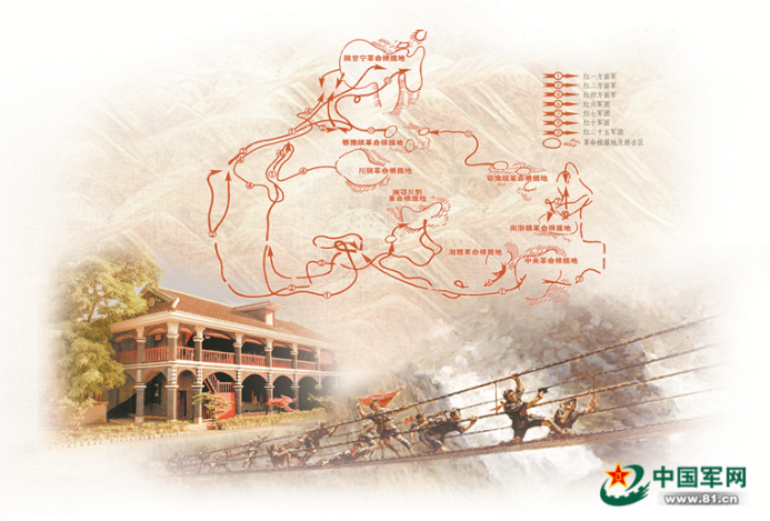 1935年3月28日,紅四方面軍以四川蒼溪塔山灣為主渡口,分三路強渡嘉陵江,突破敵人封鎖線,揮師踏上長征路。1935年6月,紅四方面軍與中央紅軍在四川懋功首次會師,隨后調(diào)頭南下;1936年10月9日到達甘肅會寧,與紅一方面軍會師。紅四方面軍行程一萬余里,途經(jīng)4個省,其中在四川省的時間長達18個月。