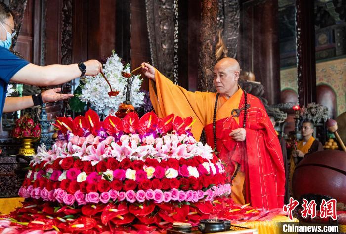 2021年5月19日,中國(guó)佛教協(xié)會(huì)在北京廣濟(jì)寺舉辦佛誕節(jié)慶祝活動(dòng)。圖為中國(guó)佛教協(xié)會(huì)會(huì)長(zhǎng)演覺在浴佛儀式上舀起凈水灌沐釋迦太子像?!≈行律缬浾?侯宇 攝