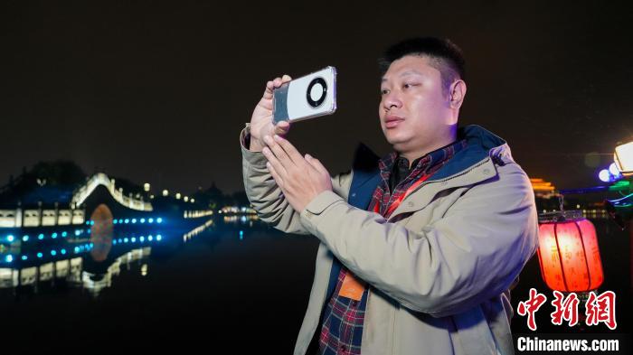 10月21日海外華文媒體代表在開封大宋御河記錄夜景。李超慶 攝