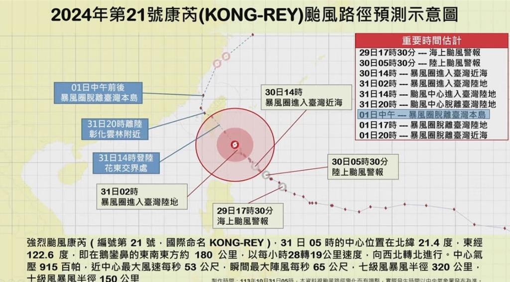 災(zāi)害應(yīng)變中心上午9時召開第5次工作會報?!翱的荨憋L(fēng)雨影響預(yù)計今日至明日清晨最為顯著,目前蘭嶼、綠島已有14級以上強(qiáng)陣風(fēng),宜蘭、花蓮、臺東將有局部豪雨等級以上降雨發(fā)生,臺島北部、南部地區(qū)及中部山區(qū)亦有大雨或豪雨,今日臺風(fēng)中心登陸后并持續(xù)西移至臺灣海峽的過程,南部地區(qū)雨勢增大,中部地區(qū)降雨亦稍增加,另外提醒民眾各沿海易有長浪發(fā)生,請避免前往海邊活動。