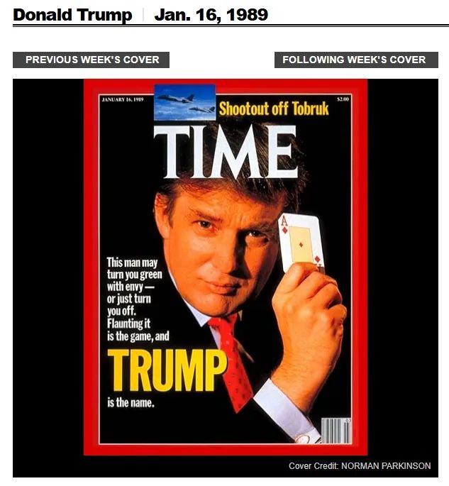 1989年,特朗普第一次登上《時代》封面。那一期封面介紹道:“這個男人可能讓你羨慕嫉妒恨——手法叫炫富,名字叫特朗普”。當年,身為成功地產(chǎn)商人的特朗普,手持一張撲克牌抵著腦門,眼神里透著運籌帷幄的自信。