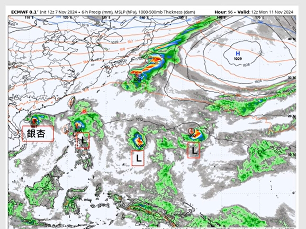 歐洲模式仿真,下周一菲律賓東方外海至關(guān)島附近,有3個(gè)熱帶低壓或臺(tái)風(fēng)。(翻攝賈新興YouTube)