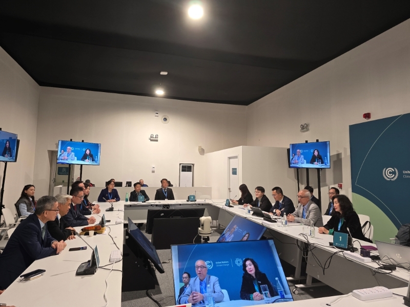 當(dāng)?shù)貢r間11日,謝展寰抵達阿塞拜疆后,聯(lián)同財經(jīng)事務(wù)及庫務(wù)局常任秘書長(財經(jīng)事務(wù))甄美薇與香港金融發(fā)展局及香港地球之友會面,了解兩個組織同日于氣候變化大會會場內(nèi)中國角聯(lián)合舉辦的邊會活動之成果,并討論綠色金融、經(jīng)濟綠色轉(zhuǎn)型、國際碳市場等議題。