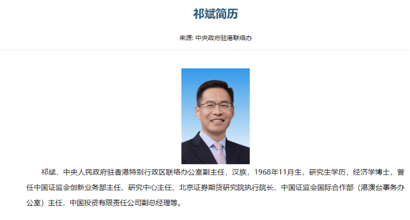 中央政府駐港聯(lián)絡(luò)辦官方網(wǎng)站已更新人事信息。據(jù)中聯(lián)辦網(wǎng)站顯示,祁斌,男,漢族,1968年11月生,研究生學(xué)歷,經(jīng)濟學(xué)博士,曾任中國證監(jiān)會創(chuàng)新業(yè)務(wù)部主任、研究中心主任、北京證券期貨研究院執(zhí)行院長,中國證監(jiān)會國際合作部(港澳臺事務(wù)辦公室)主任,中國投資有限責(zé)任公司副總經(jīng)理等。