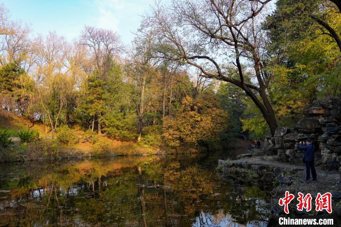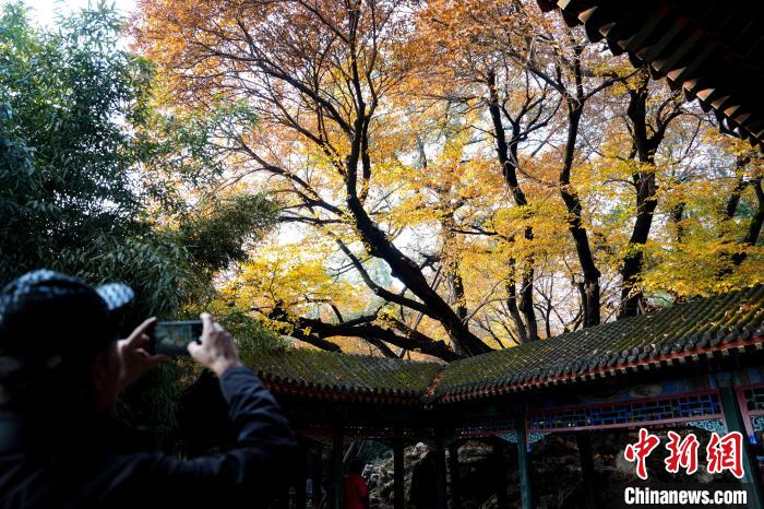 11月14日,北京天氣晴好,頤和園秋色吸引游客觀賞、拍照。圖為民眾在頤和園諧趣園賞秋景。中新社記者 張祥毅 攝