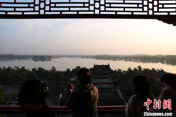 11月14日,北京天氣晴好,頤和園秋色吸引游客觀賞、拍照。圖為民眾在頤和園萬壽山賞秋景。中新社記者 張祥毅 攝
