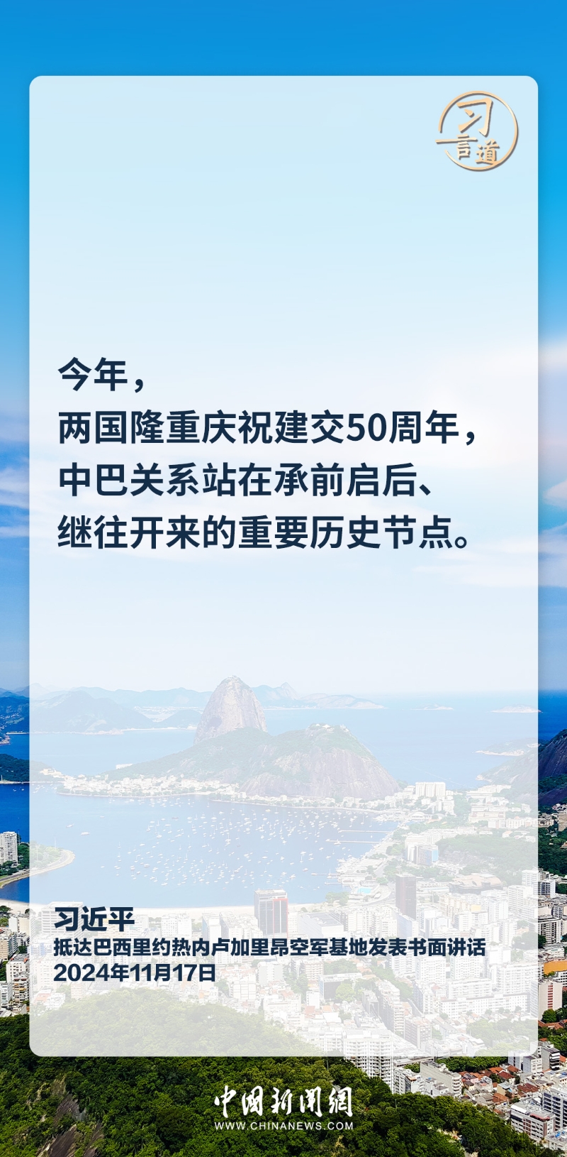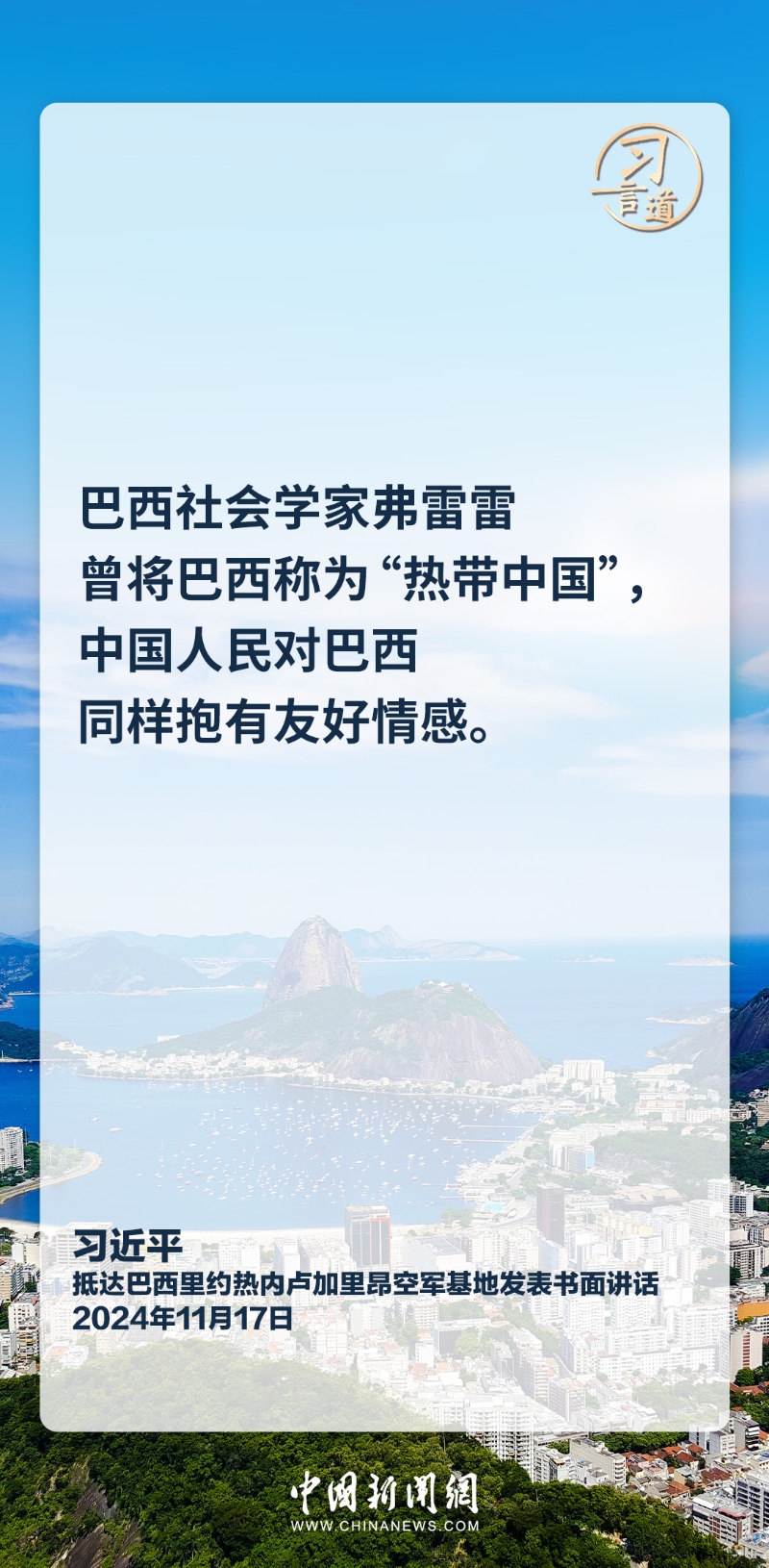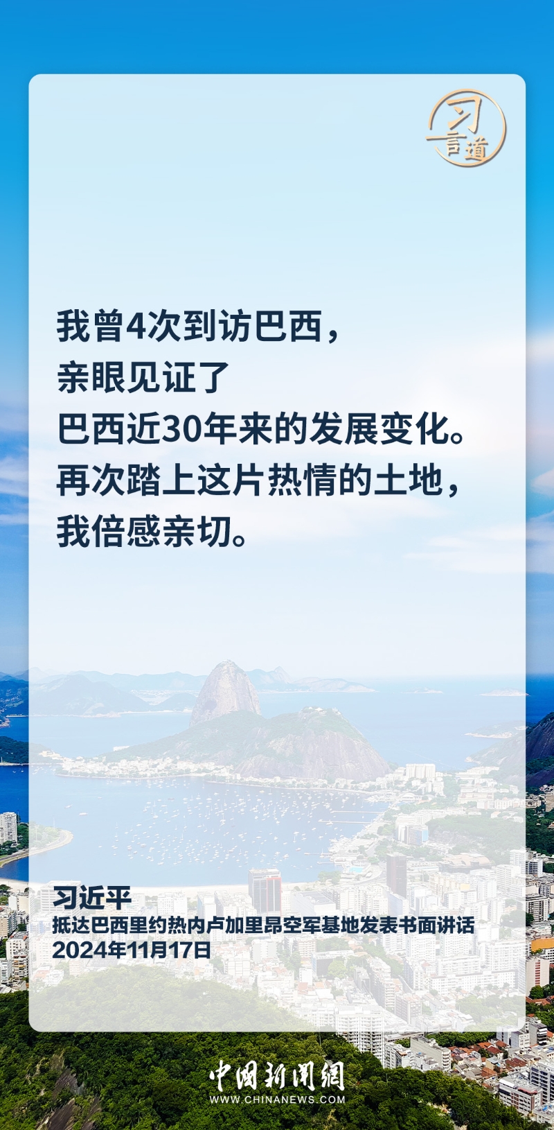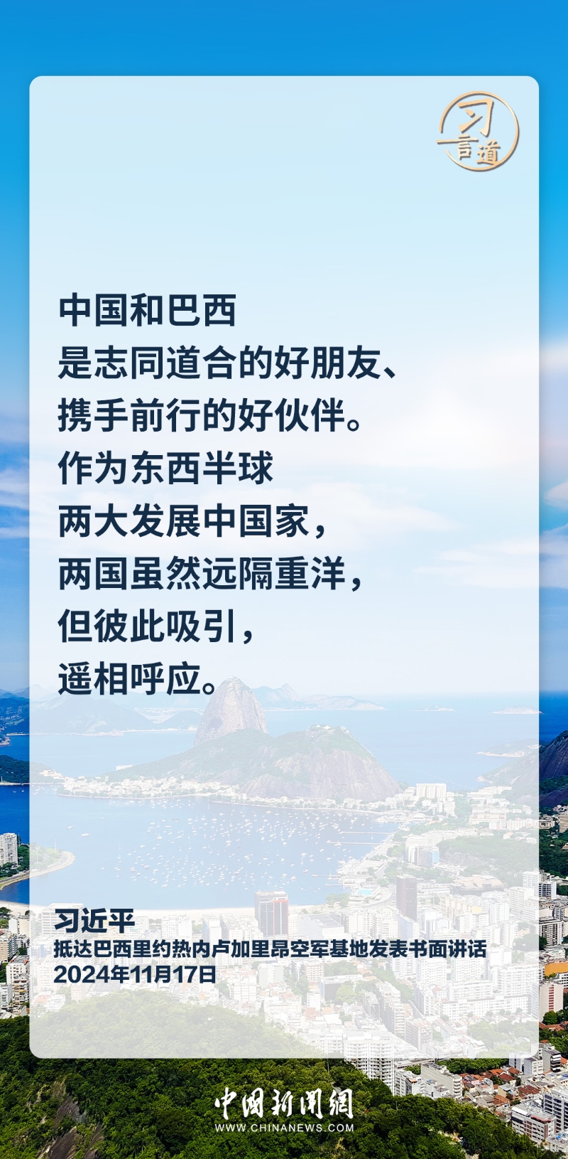 當(dāng)?shù)貢r(shí)間11月17日,中國(guó)國(guó)家主席習(xí)近平乘專機(jī)抵達(dá)里約熱內(nèi)盧,應(yīng)巴西聯(lián)邦共和國(guó)總統(tǒng)盧拉邀請(qǐng),出席二十國(guó)集團(tuán)領(lǐng)導(dǎo)人第十九次峰會(huì)并對(duì)巴西進(jìn)行國(guó)事訪問。習(xí)近平發(fā)表機(jī)場(chǎng)書面講話,他指出——