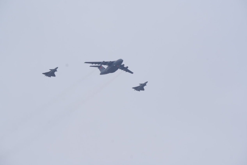 2023年,第十批在韓中國人民志愿軍烈士遺骸回國,“運-20”和兩架護航飛機“殲-20”。人民網記者 邱宇哲攝