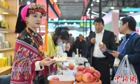 11月28日,廣東省廣州市,第二十一屆中國國際農(nóng)產(chǎn)品交易會開幕。本屆農(nóng)交會以“加快發(fā)展現(xiàn)代農(nóng)業(yè) 推進(jìn)鄉(xiāng)村全面振興”為主題,展覽面積超10萬平方米,近3000家企業(yè)攜2萬余種展品參展。圖為四川甘孜州的蘋果吸引采購商品嘗。中新社記者 陳楚紅 攝