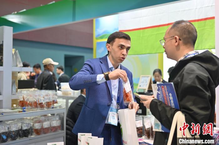 圖為烏茲別克斯坦展位的干果吸引采購商購買。中新社記者 陳楚紅 攝