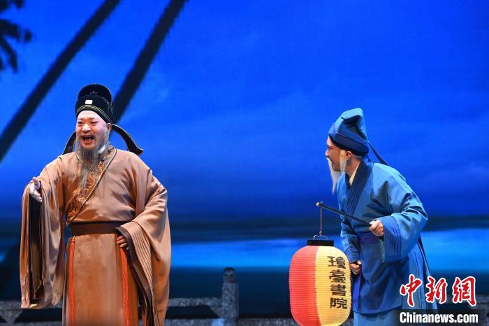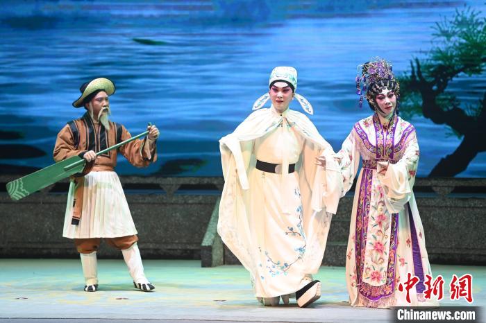 11月29日,廣州市荔灣區(qū),“第二十一屆穗港澳粵劇日”系列活動在粵劇藝術博物館舉行,穗港澳三地粵劇名家齊聚一堂,共襄粵劇盛宴。圖為第十九屆中國戲劇梅花獎得主曾慧(右)與著名青年文武生司馬祥(中)獻上《五湖煙波侶》首演。中新社記者 陳楚紅 攝