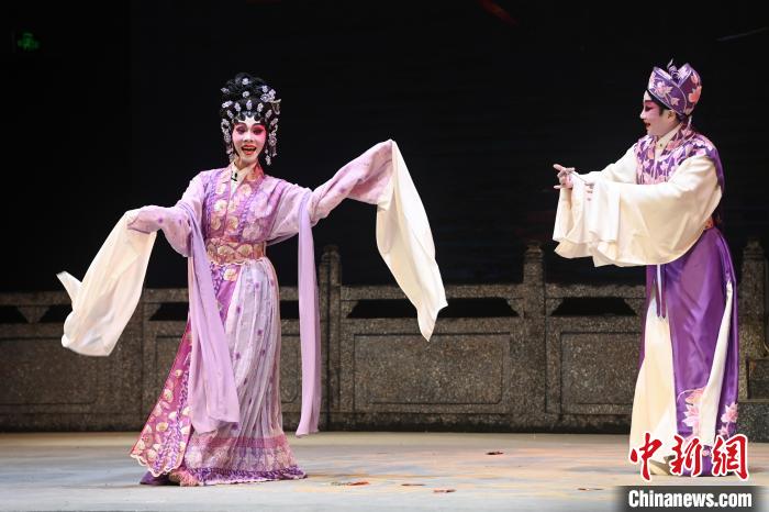 11月29日,廣州市荔灣區(qū),“第二十一屆穗港澳粵劇日”系列活動在粵劇藝術博物館舉行,穗港澳三地粵劇名家齊聚一堂,共襄粵劇盛宴。圖為香港粵劇演員會理事長、香港藝術發(fā)展局戲曲組主席、著名粵劇女文武生劉惠鳴與香港著名花旦林穎施共同演繹經(jīng)典劇目《紫釵記》之燈街拾翠。中新社記者 陳楚紅 攝