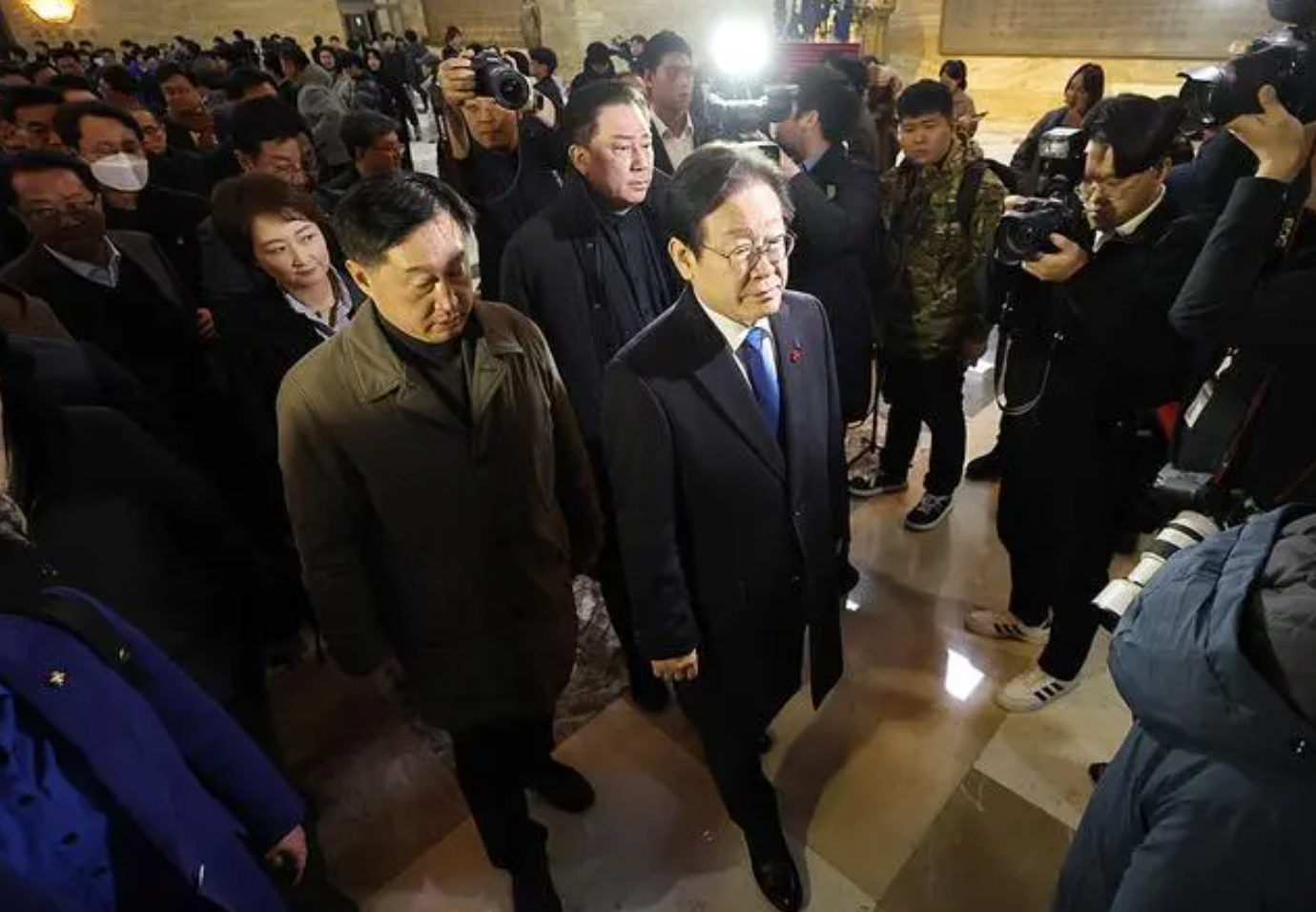 當?shù)貢r間2024年12月4日,韓國首爾,韓國最大在野黨黨首李在明與議員前往韓國國會參加緊急非公開的議員會議。