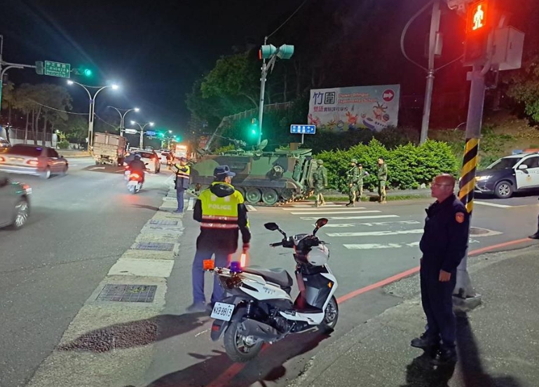 1輛CM-23臺(tái)軍陸軍裝甲迫炮車(chē)于進(jìn)行科目演練時(shí),因故障停在中間車(chē)道。(淡水警分局提供)