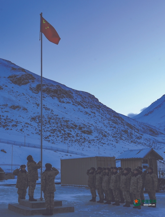 清晨,官兵在某執(zhí)勤點位升起國旗。