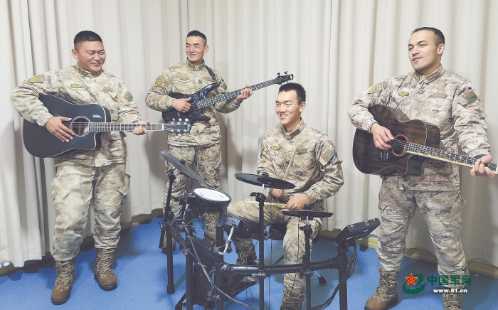 連隊“雪絨樂隊”成員利用休息時間排練歌曲。