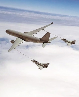 A330MRTT型空中加油機(jī)由歐洲空中客車公司研制,機(jī)長58.8米,翼展60.3米,最大載油量111噸。該機(jī)采用軟管加油,可同時(shí)為兩架戰(zhàn)斗機(jī)進(jìn)行加油,并具備空中受油能力。機(jī)艙內(nèi)有較大的運(yùn)輸空間,可兼顧人員和貨物運(yùn)輸工作。A330MRTT型空中加油機(jī)主要負(fù)責(zé)為北約作戰(zhàn)飛機(jī)提供空中加油支持,曾在阿富汗戰(zhàn)爭中為參戰(zhàn)的北約各國戰(zhàn)斗機(jī)和運(yùn)輸機(jī)提供空中加油,保障其作戰(zhàn)行動(dòng)。在海外軍事干預(yù)行動(dòng)及本土防空作戰(zhàn)演練中,該機(jī)也承擔(dān)相應(yīng)的空中加油任務(wù),提高空軍的作戰(zhàn)效能和靈活性。