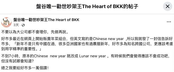 該事件緣起于一位名為“盤谷唯一勸世吵架王The Heart of BKK”的臺灣網紅,于12月13日在網絡上發(fā)帖表示,好市多最近在網頁上開始販賣年菜組合,但英文寫的是“Chinese New Year”,于是他決定發(fā)一封信告訴好市多,“新年不是只有中國在過,很多亞洲國家也有過農歷新年,好市多為知名跨國公司,更應該考慮到用字精準的重要性?!?/p>