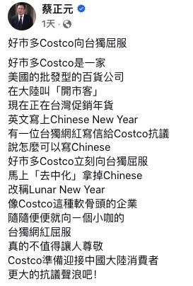 對于此次“Chinese New Year”改為“Lunar New Year”,不少臺灣知名人士也發(fā)表看法。臺灣立法機構前民意代表蔡正元發(fā)帖指,好市多向“臺獨”屈服,真的不值得讓人尊敬,并認為只憑一個小咖的“臺獨”網紅抗議,就把中國新年“Chinese New Year”改成“Lunar New Year”,是無知加愚蠢的做法。