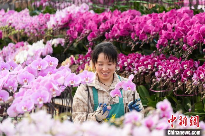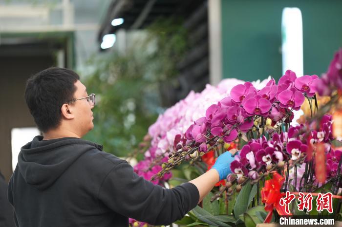 12月25日,北京黃土崗鮮花批發(fā)市場,商家在整理蝴蝶蘭植株。中新社記者 張祥毅 攝