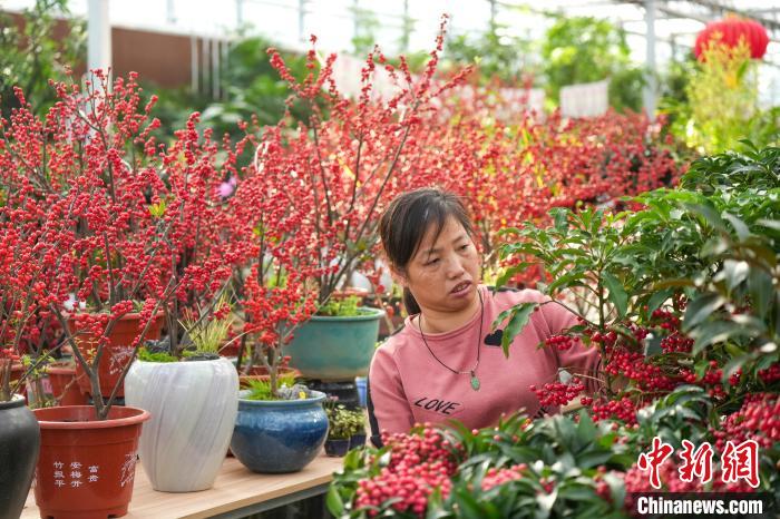 12月25日,北京黃土崗鮮花批發(fā)市場,商家在整理年宵花。中新社記者 張祥毅 攝