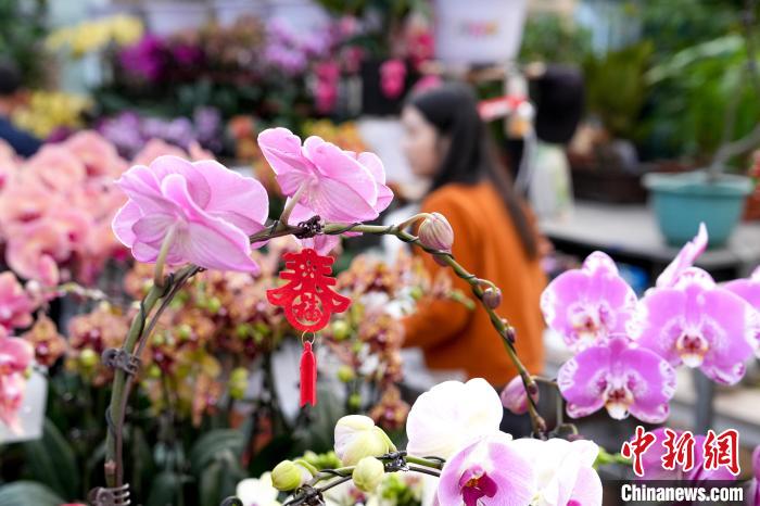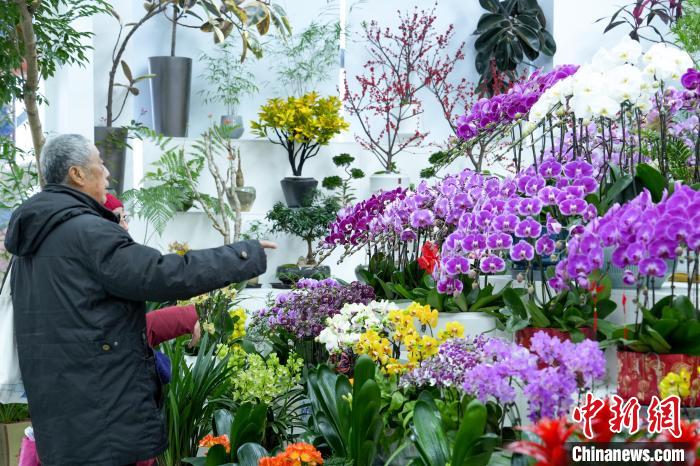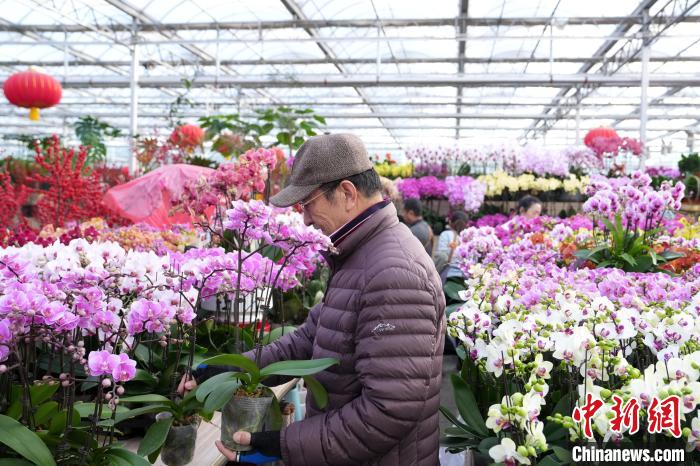 12月25日,北京花卉交易中心,市民在購買年宵花盆栽。臨近元旦,北京花卉交易中心的年宵花走俏,其中蝴蝶蘭、冬青等花卉因具有新年美好寓意而受消費者青睞。中新社記者 張祥毅 攝