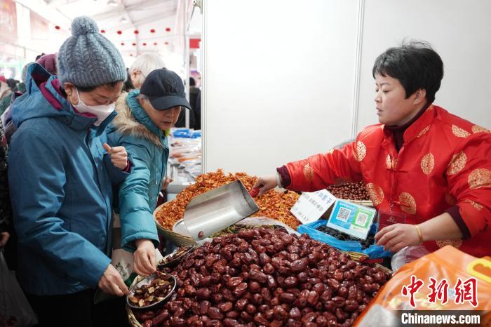 1月3日,第29屆老北京年貨大集在位于北京的全國農(nóng)業(yè)展覽館開市。圖為民眾在大集上試吃紅棗。中新社記者 張祥毅 攝